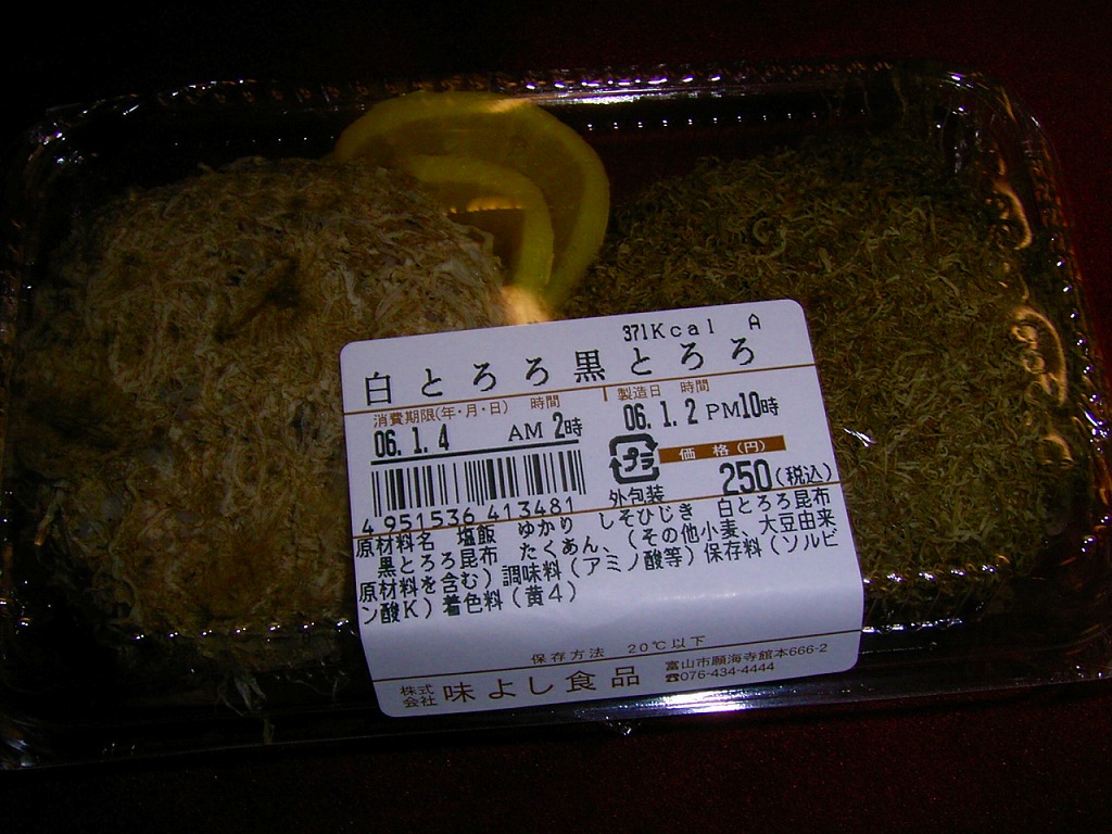 夕飯は富山で買ったとろろ昆布のおにぎり、その名も白とろろ、黒とろろ