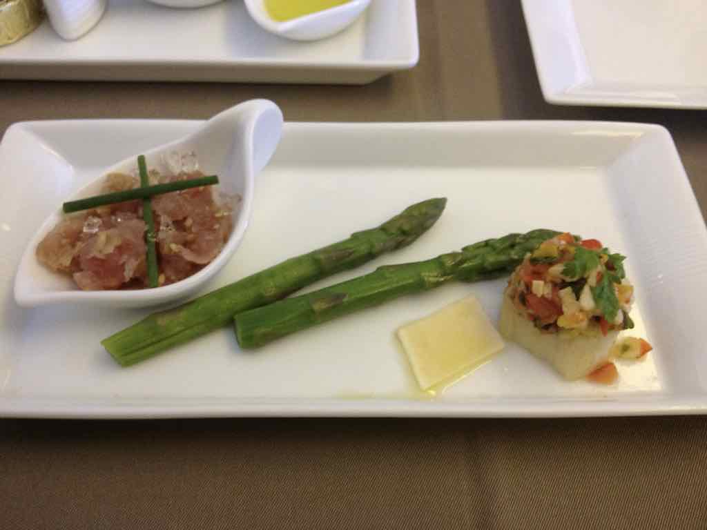 食前の小さなお皿取り合わせは ・ツナのタルタル ・アスパラガス アジアーゴチーズ添え ・帆立のグリル カポターナ添え