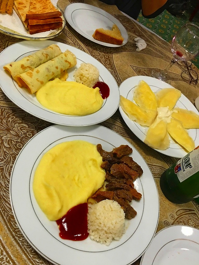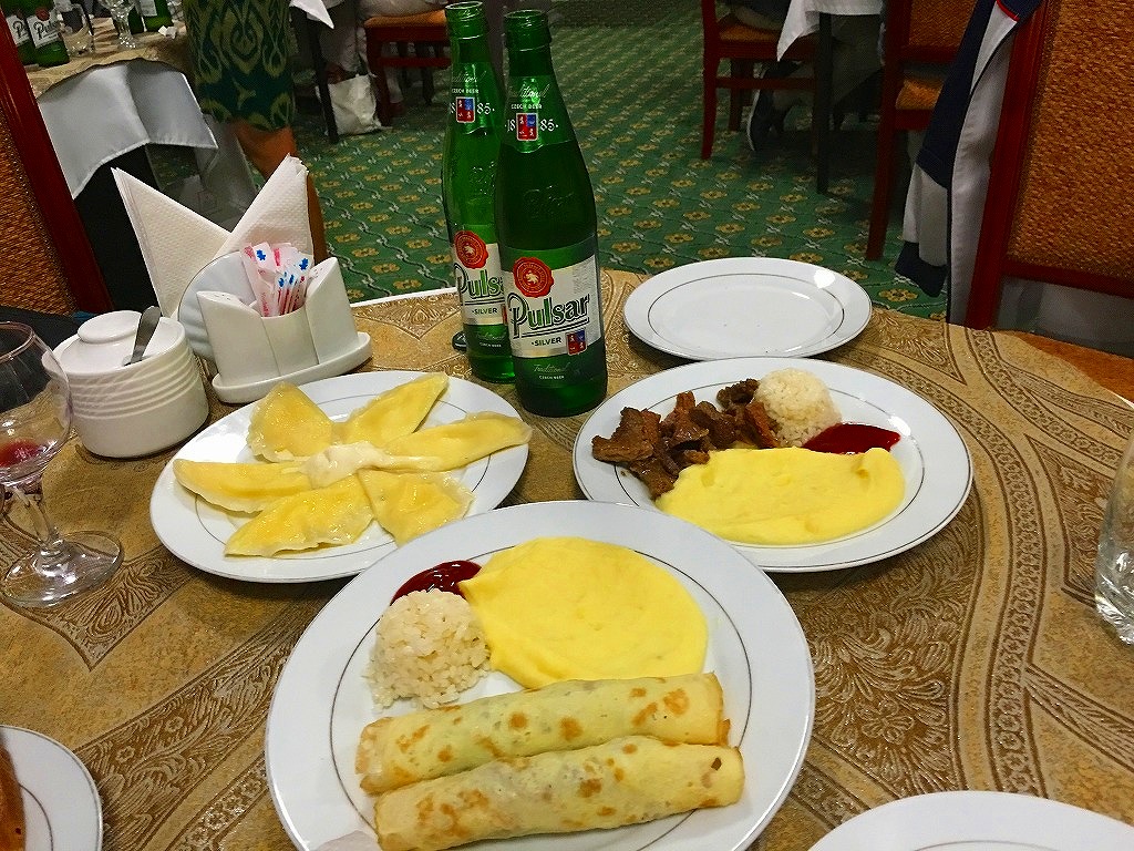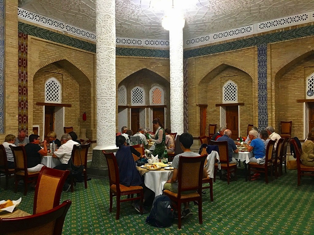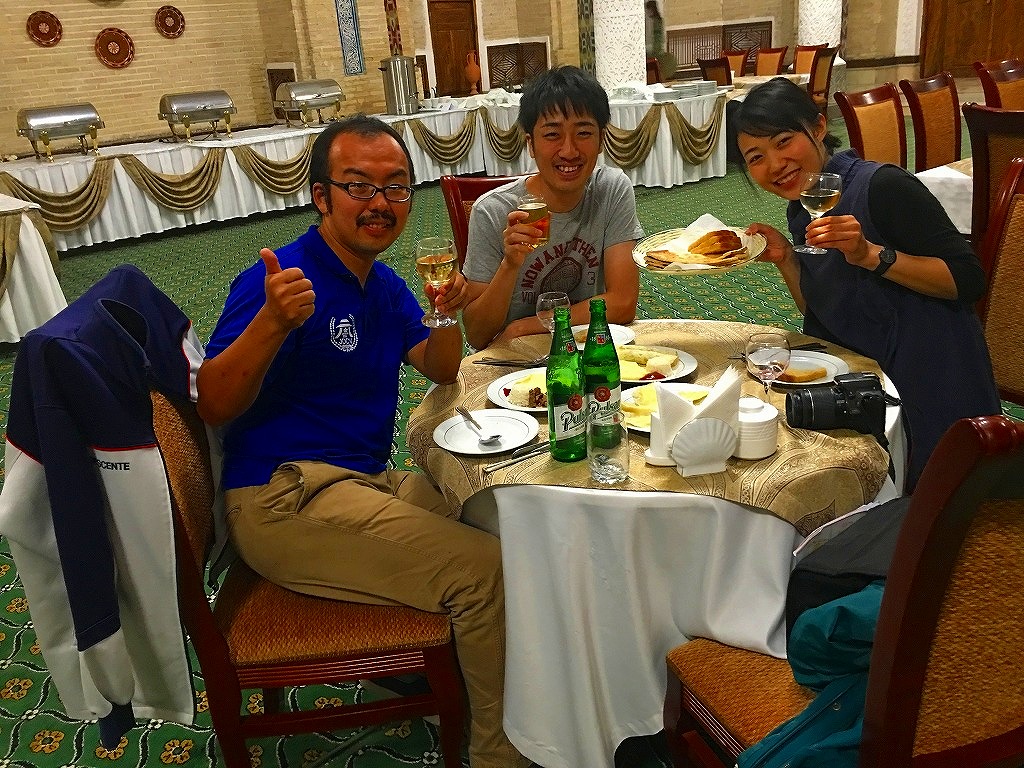 20160925 ツーリストさんと夕食 今日は夕食をツーリストさんたちとご一緒にマドラサを改修した、オリエントスターホテルのレストラン中庭に屋根を載せて食堂ホールを作っているのは魔改造今日の夕食はホラズム料理を基本とした創作料理テュフンバルク・ビーフステーキ・シャシュリクのオムレツ巻きみんなで一緒に、ハイチーズおいしいワインに話は弾み遅くまで飲み明かしましたにほんブログ村ランキングに参加しています、各バナーのいずれかをクリック頂ければ、活動の励みになります(新規ウインドウで開きます)