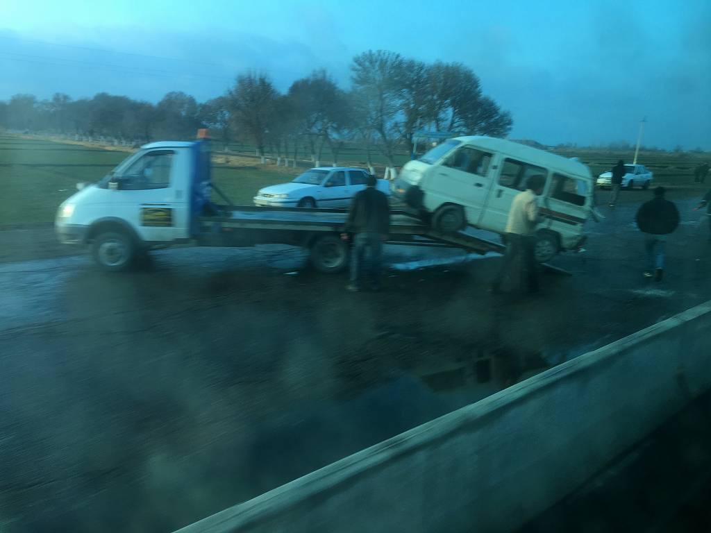 20170111 バスはウズベクの大地を進む ウルゲンチからはサマルカンド行きのバスも折り返し地点を突破16:20にブハラに停車、多くのお客様が下りていく体格のいい運転手さん、安心の運転技術ブハラはお客様の乗降だけですぐに出発ブハラを出ると沿道は雨模様クラッシュしたタクシーとダマス、いつもこの国のタクシーは怖いにほんブログ村ランキングに参加しています、各バナーのいずれかをクリック頂ければ、活動の励みになります(新規ウインドウで開きます)