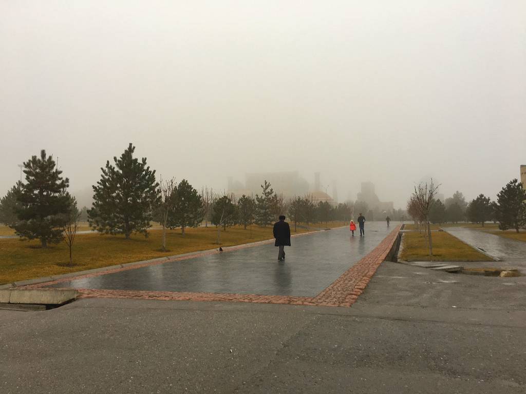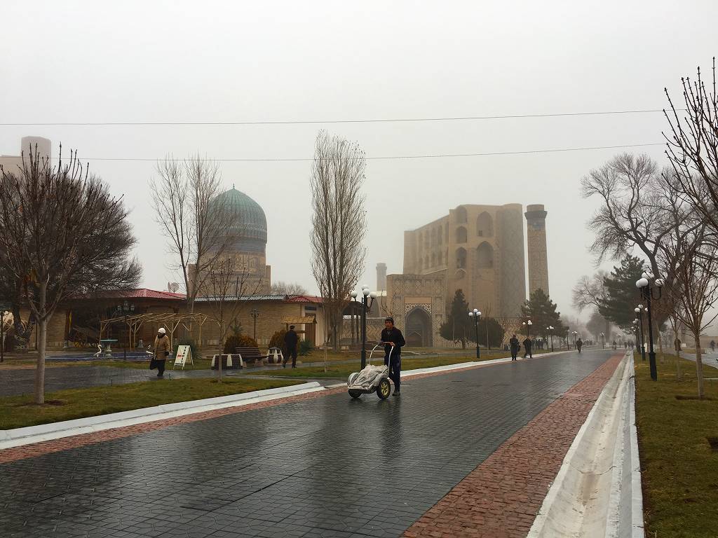 サマルカンド青空に映える青屋根ってイメージがあるけど、霧雨にむせぶ光景もこれはこれで幻想的である。