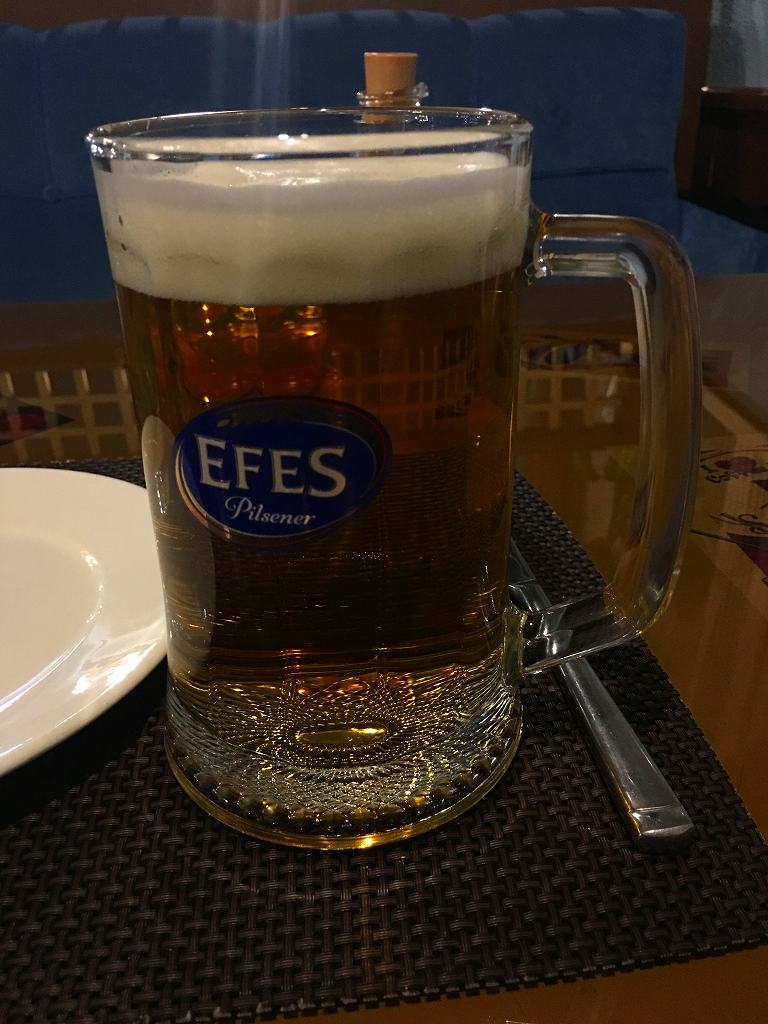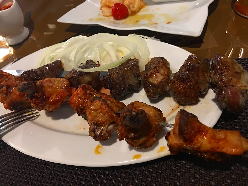 20170217 アルマトイの夕食 夕食は飲みに行きました夕食はホテルの近くのお店カフェインで、カザフ料理を筆頭になんでもありのお店ですとりあえずビールからシュリンプのアソート、久々の魚介類カザフスタン人は世界で2番目に肉を多く食うといわれるが(ちなみに1番は狼!)シャシュリクが馬鹿でかい!心地よい肉補給。5,170テンゲ(約1,903円)