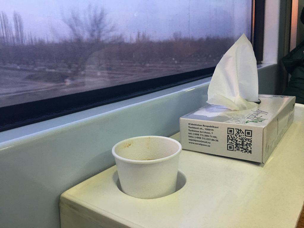20170223 ウズベキスタン号でタシケントへ 今日はアンディジャンから直行で帰る予定だったけど、昨夜やっとチケットが取れたので急遽予定変更。タシケントで下車し、一つ用を済ませてから帰ることに。朝六時代発のウズベキスタン号の2等座席者はセミコンパートメント4個室でしたが1人利用で座席は快適。新聞に、イヤホン飲み物のサービスもありましたにほんブログ村ランキングに参加しています、各バナーのいずれかをクリック頂ければ、活動の励みになります(新規ウインドウで開きます)