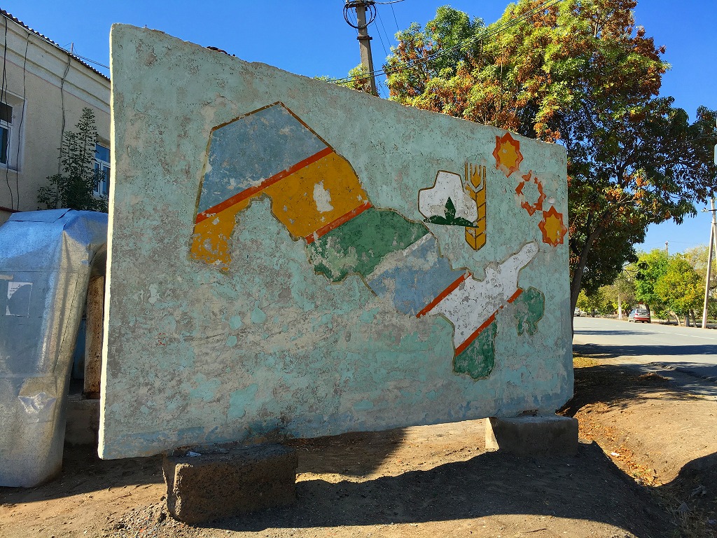 ソビエト時代に作られたというカラカルパクスタンカラーの看板(解読不能)